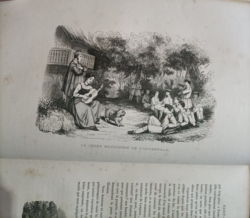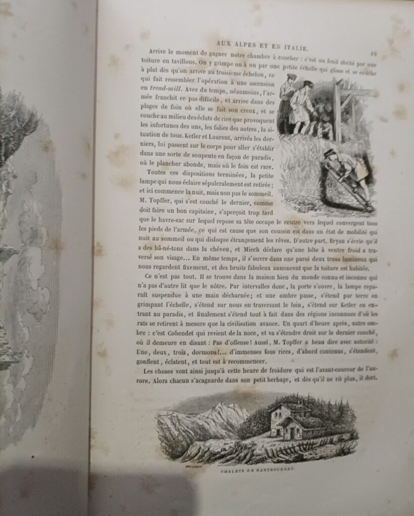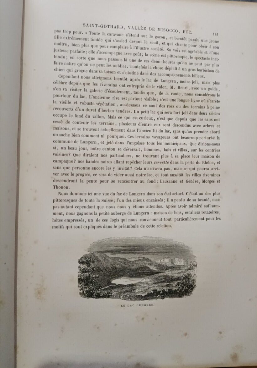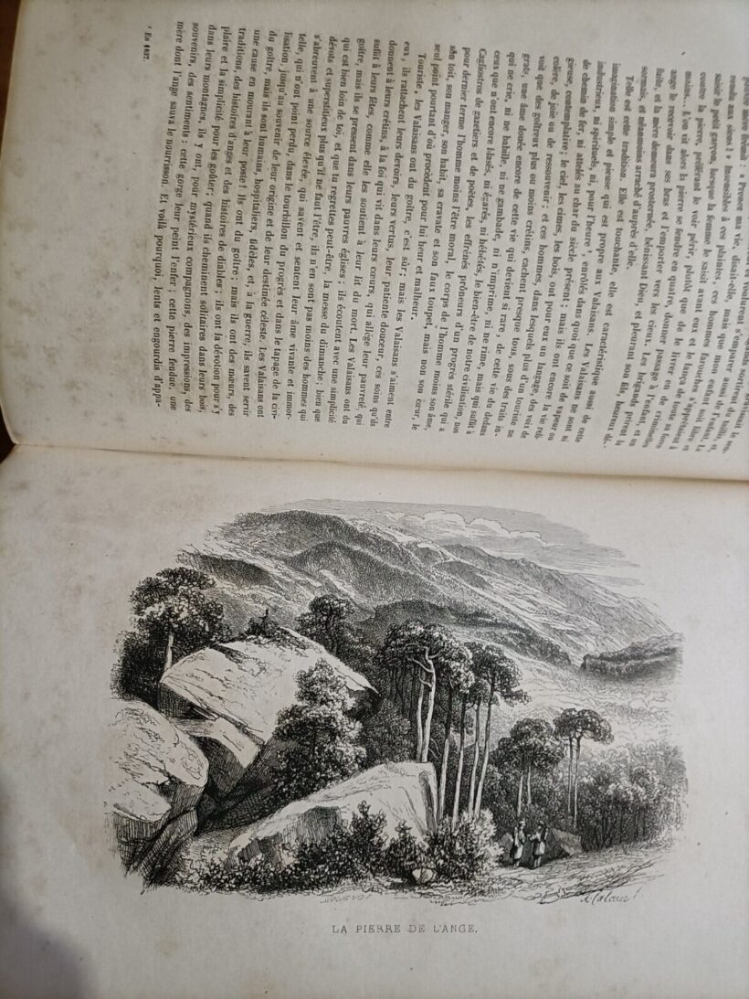Libro di viaggio attraverso le Alpi passando per Milano, Como e Chamounix. Il viaggio prosegue per Venezia, Brennero, Bolzano con ritorno dal lago di Garda, Caprino verso la Svizzera. Bellissime e numerose le incisioni sia a pinna pagina che nel testo con le vedute dei luoghi visitati. B